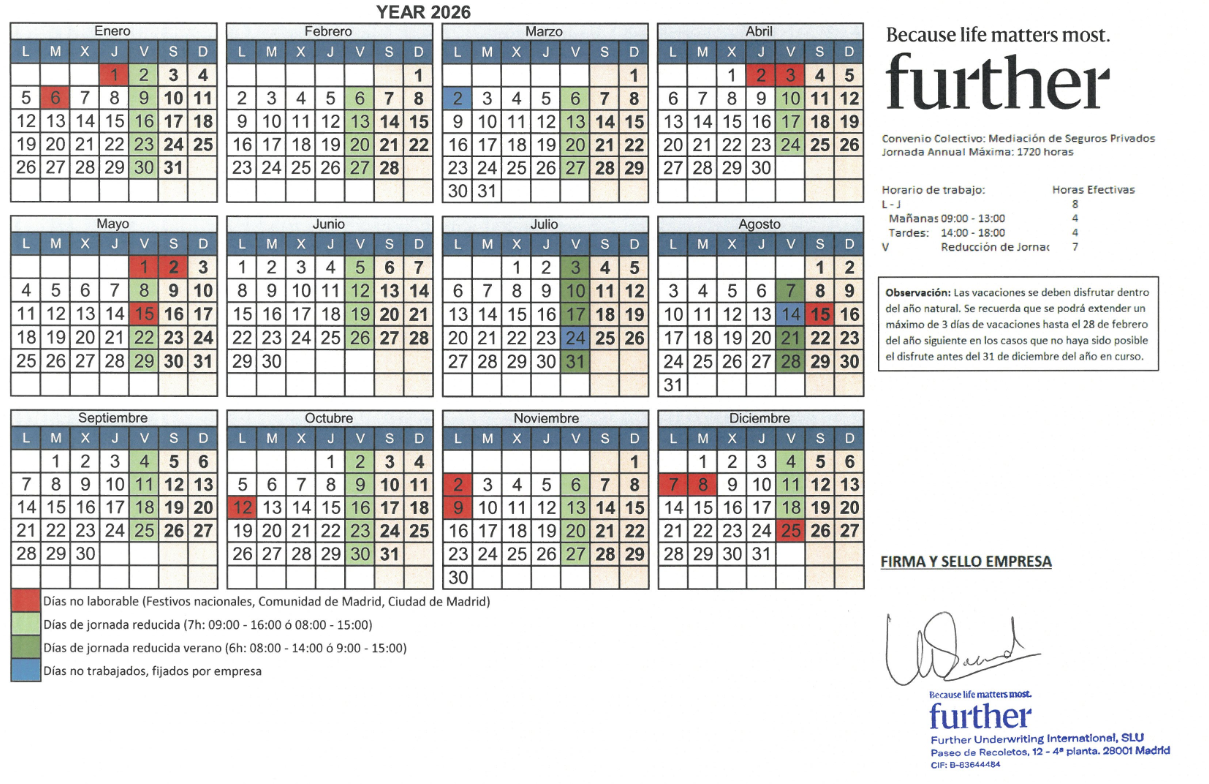 We are pleased to announce the 2026 Working Calendar for Spain, enclosed to this email. The calendar includes national, regional, and local bank holidays, as well as the applicable daily working hours.